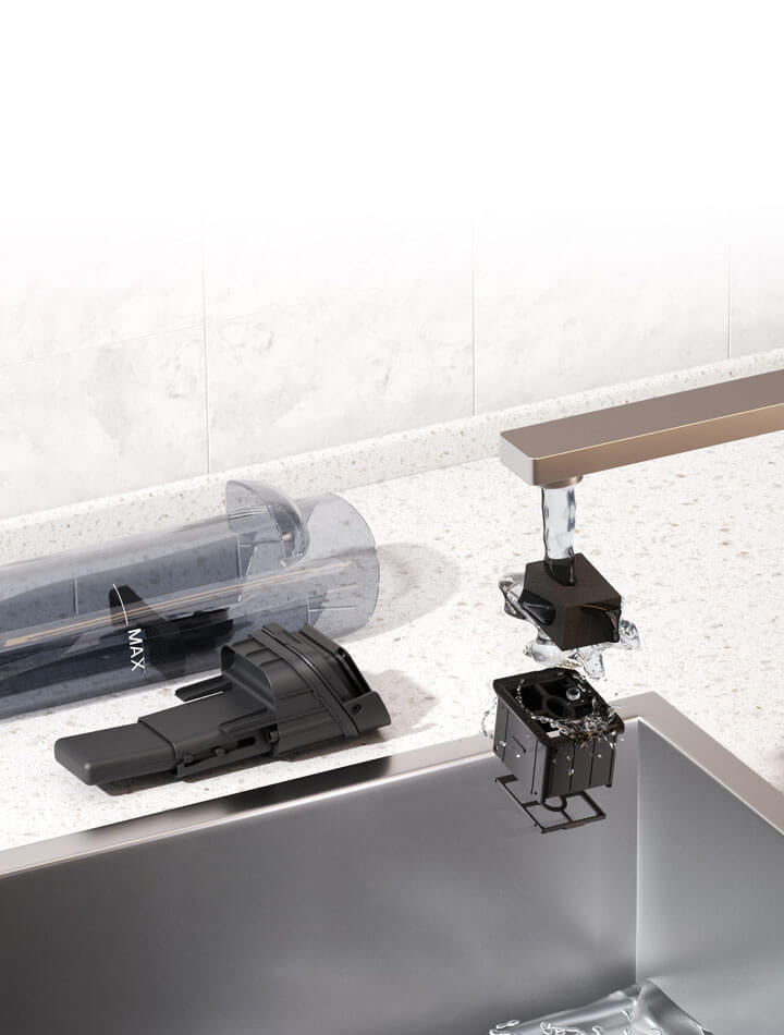 разделяет твердые отходы и жидкость, делая очистку проще, чище и без контакта с грязью