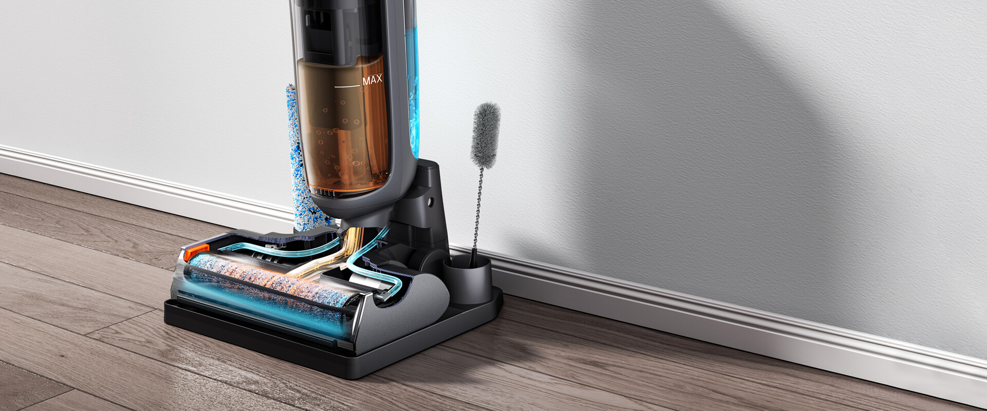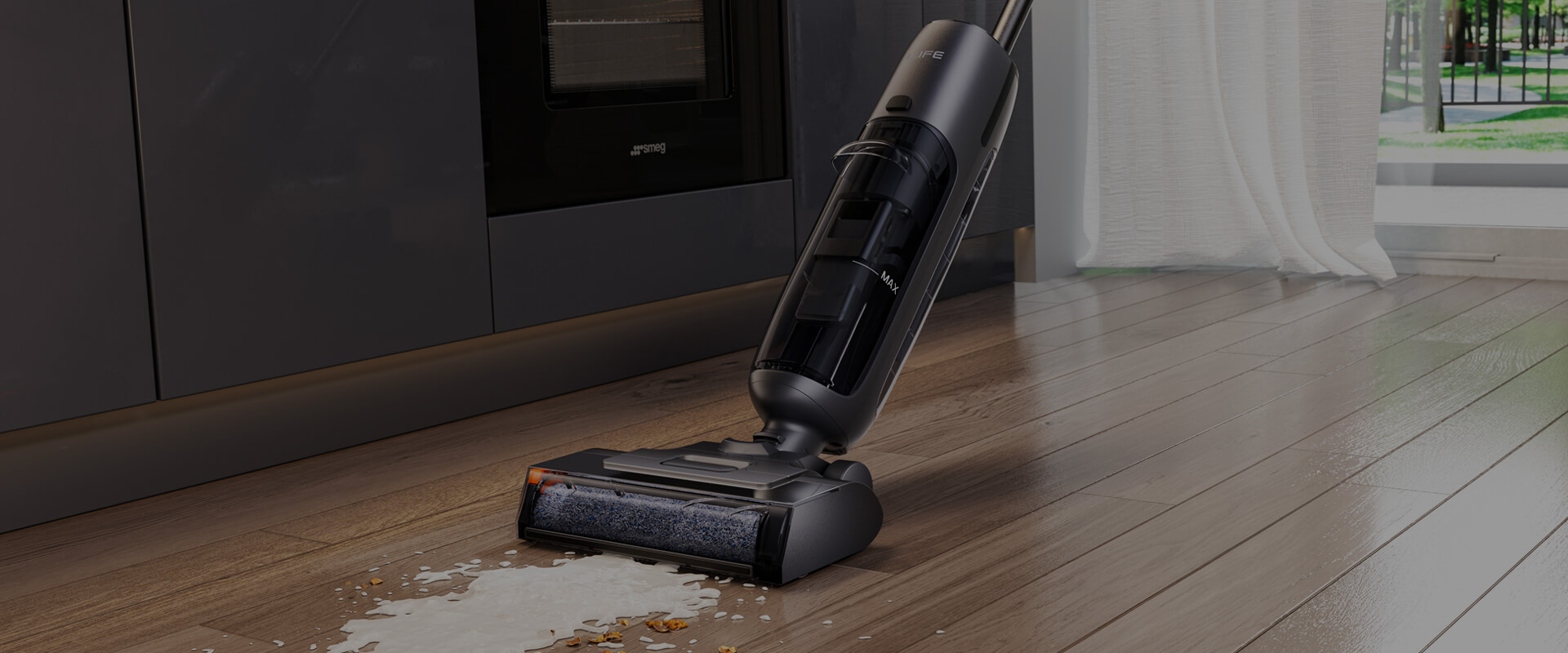 Благодаря всасыванию 7000 Па и высокоскоростной системе очистки, устройство легко справляется с влажной и сухой грязью на любых твердых полах, устраняет до 99,99% бактерий и возвращает полу идеальный блеск.