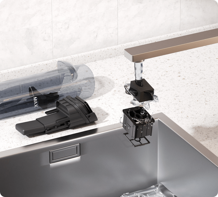 разделяет твердые отходы и жидкость, делая очистку проще, чище и без контакта с грязью